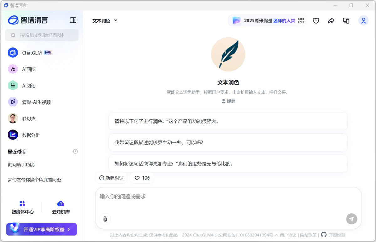 智谱清言,拥有千亿参数对话模型,支持多轮对话,具备内容创作、信息归纳总结等能力。基于ChatGLM中英双语大模型开发,通过万亿字符的文本与代码预训练,结合有监督微调技术,具备通用问答、多轮对话、创意写作、代码生成、虚拟对话、AI画图、文档和图片解读等能力。期待成为你的得力助手,无论在工作、学习,还是日常生活中我们都一直陪伴你。