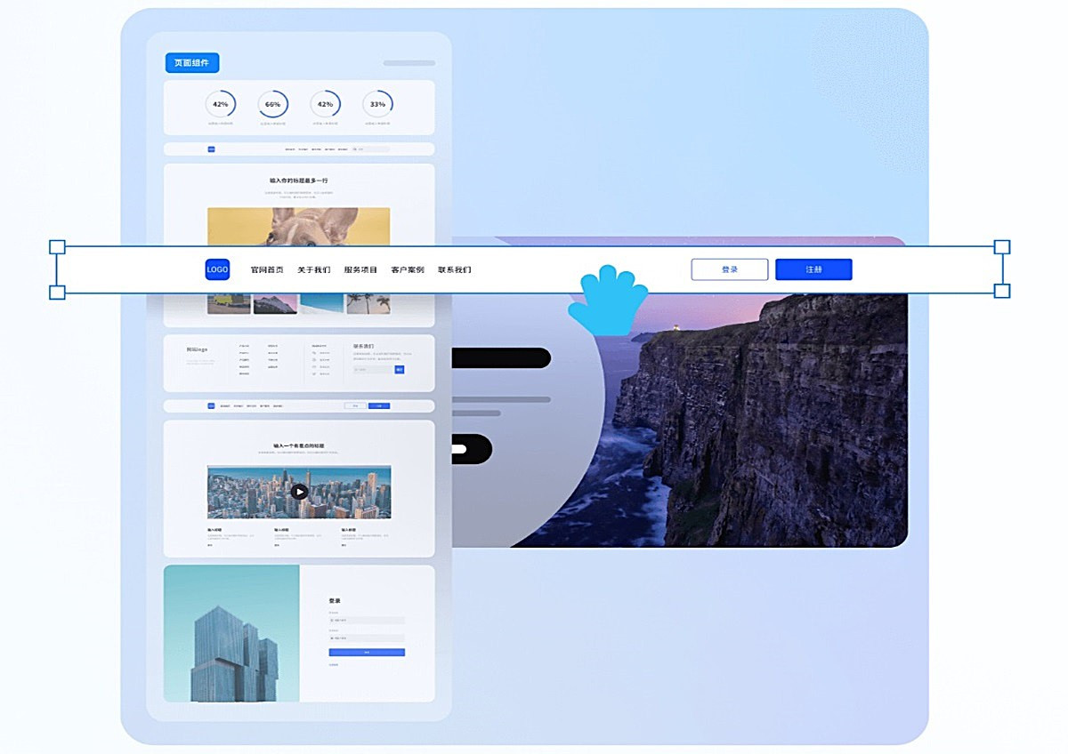 ●海量组件:提供导航、按钮、弹窗等网站设计高频使用的组件,拖拽即可快速搭建网页原型