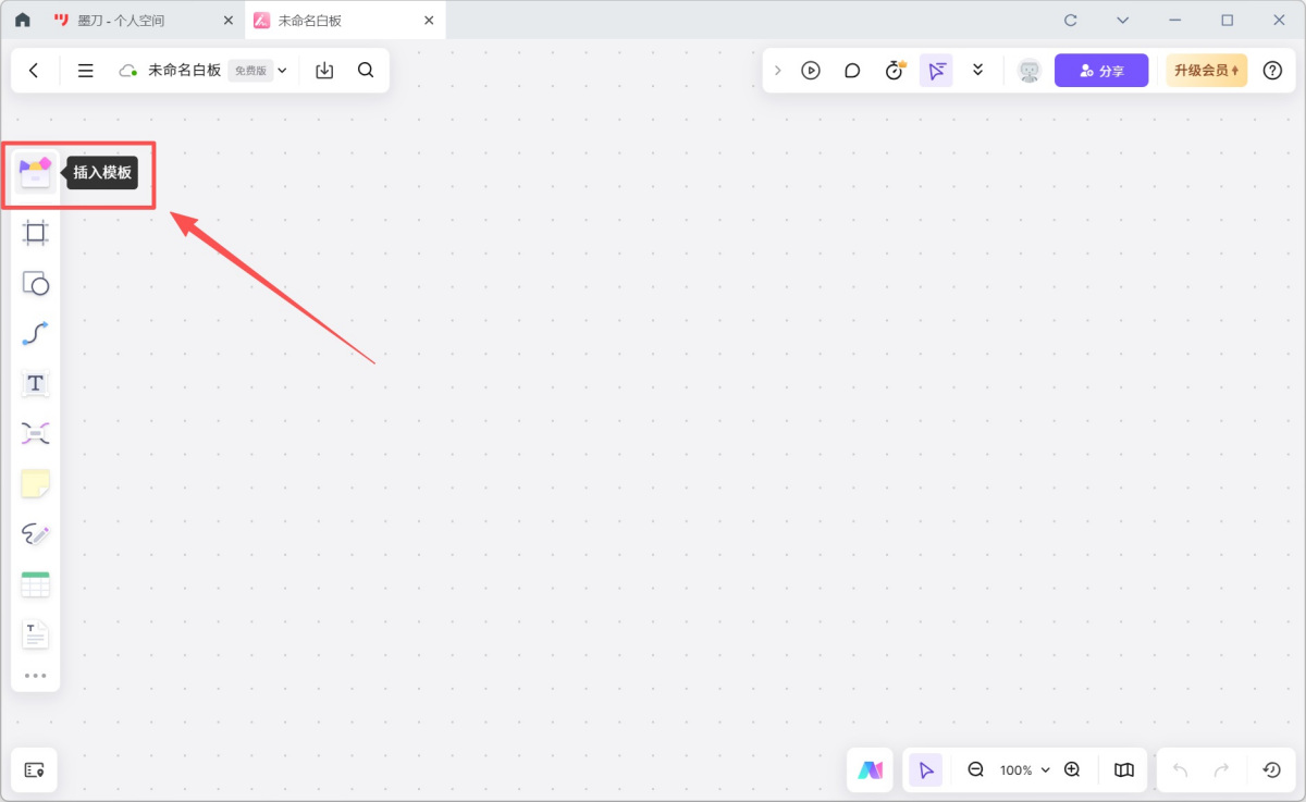 2、进入白板后,点击左侧第一个图标【插入模版】。