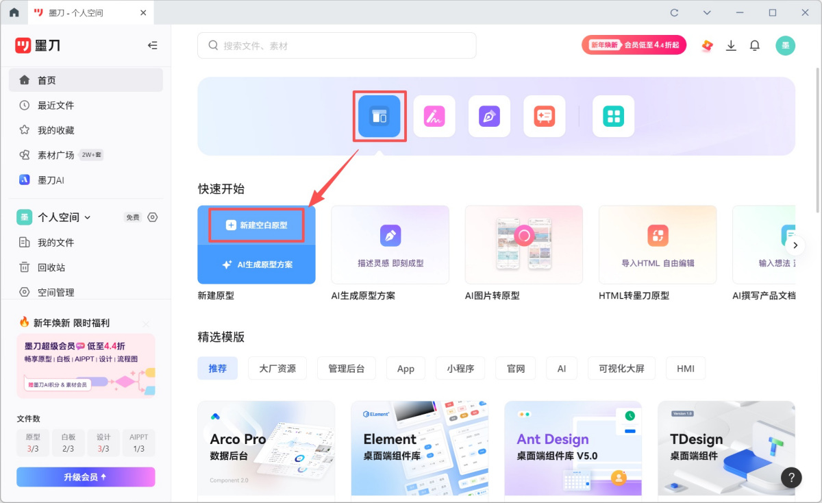 1、打开墨刀客户端,选择【墨刀原型工具】,点击【新建空白原型】。