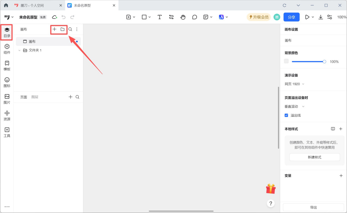 2、选择左侧栏【目录】,点击【+】新建画布,点击【文件夹图标】新建画布文件夹。