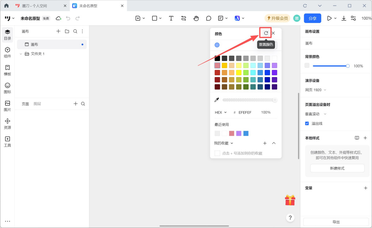 4、若要删除画布颜色,点击下图所示按钮【重置颜色】即可。