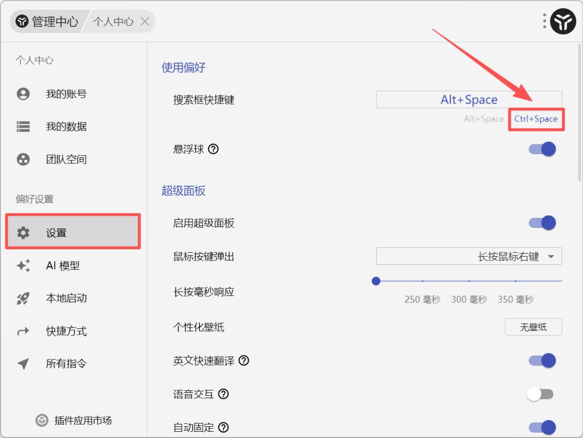 步骤2、选择左侧【设置】,默认快捷键为Alt+Space,点击【Ctrl+Space】即可切换快捷键。