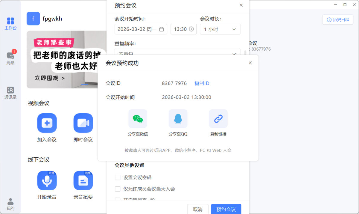 步骤3、预约成功后,可将会议分享给他人。