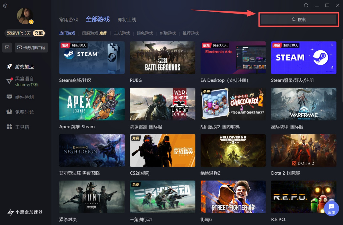 2、登录后,在右上角【搜索】您需要加速的游戏。