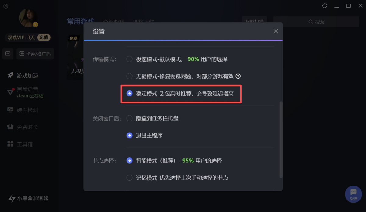 【注意】没有哪个模式是最好的,windows系统以及网络差异性太大;如果没有加速效果的时候,可以尝试其他模式。如果游戏内出现丢包,可以在设置里面设置稳定模式,然后重新加速(特别是有的校园网丢包严重,可以在设置里面使用稳定模式)