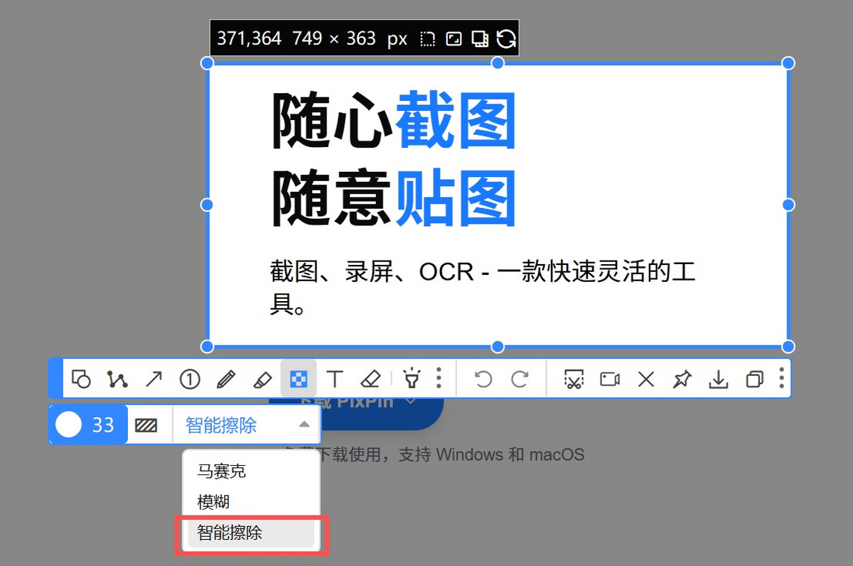 所有的PixPin用户在截图时使用标注工具,可以用右键点击自动选择UI元素的范围,而会员在图像贴图标注时,也可以使用右键自动选择鼠标指向的文本。
