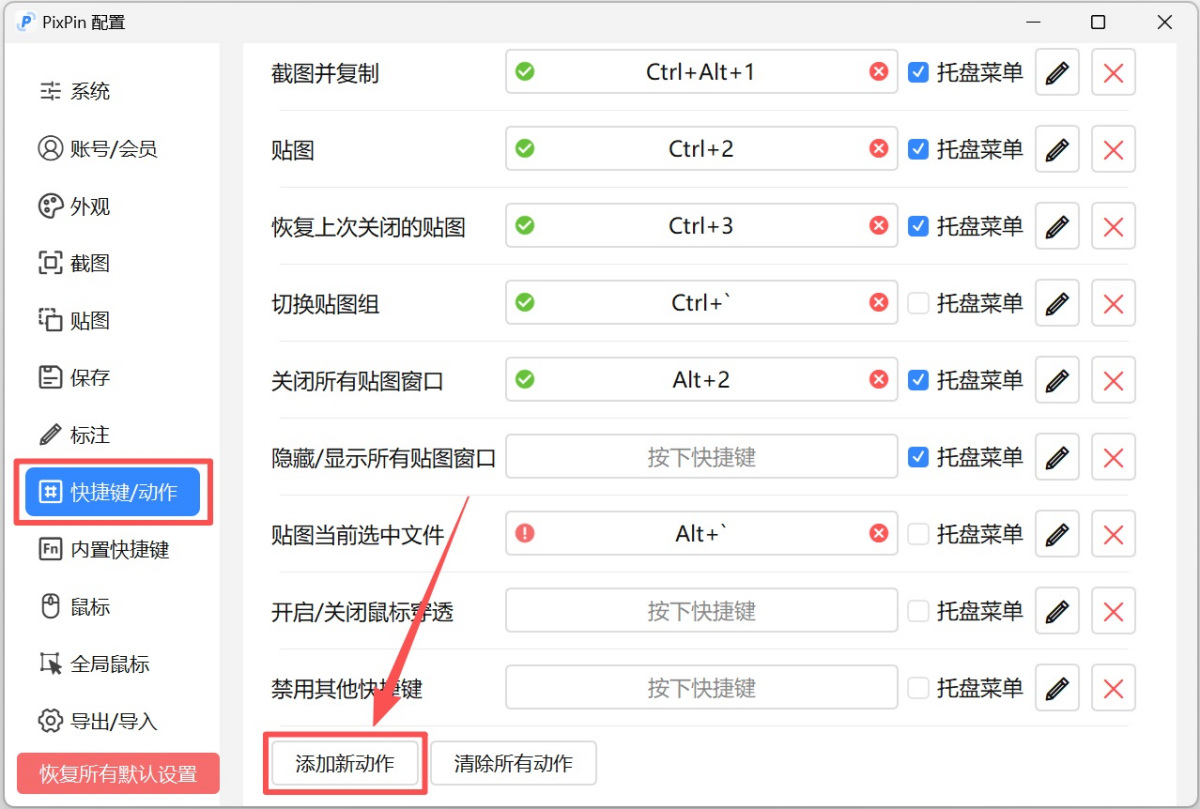 2、在【快捷键/动作】页面中点击【添加新动作】。