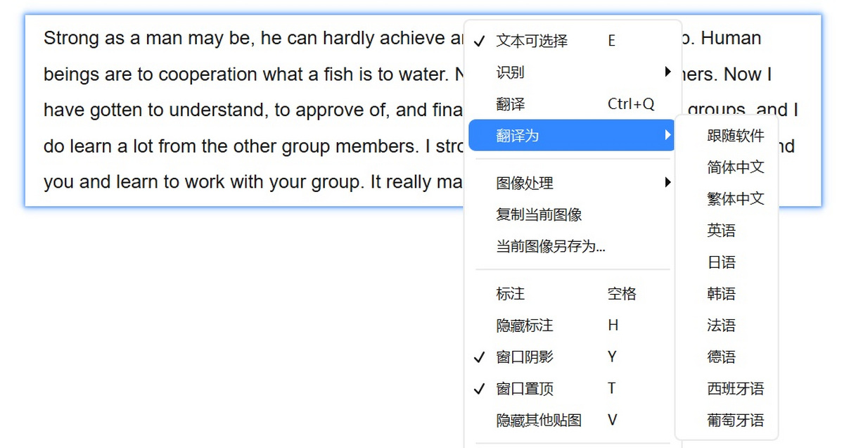 会员用户可以在文本贴图和图像贴图上通过右键菜单或者翻译快捷键Ctrl + Q使用翻译功能。