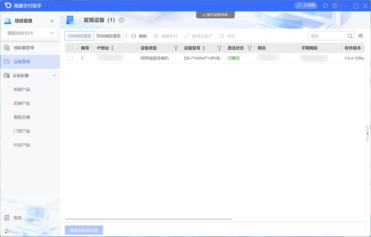 海康交付助手是一款专注于硬件产品交付的工具软件,集成了SADP功能,支持设备发现、一键激活、网络配置、重置密码等,另外它还提供一系列高效的批量操作(升级、参数配置、修改密码、IP迁移等功能)。