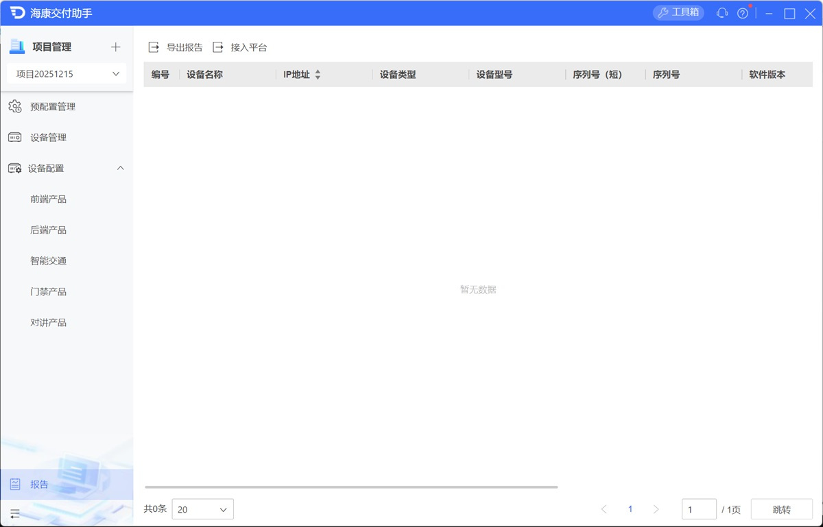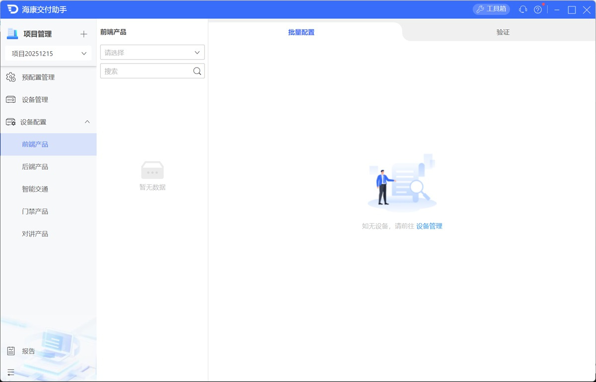 海康交付助手是集设备管理、参数配置、设备状态检测等功能为一体的软件, 面向交付人员(如安装商、服务商、集成商、技术人员),支持批量添加、激活、升级、配置视频设备、 网络视频录像机、门禁设备、可视对讲设备、智能交通设备、音频传感设备、出入口LED显示屏、车位管理LED显示屏 、分布式多屏控制器、报警设备、网络设备、智慧屏、视频会议等设备,同时支持使用配置模板一键下发配置,可简化交付过程,设备配置完成后,可导出项目的设备清单,用于后续维护。