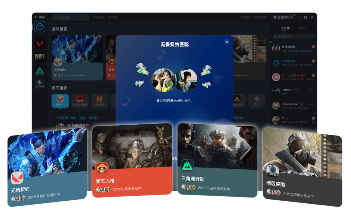 TT语音,专注打造极致开黑体验!玩家可在平台享受免费的便捷、流畅、稳定的语音工具。上TT,随时有玩伴!