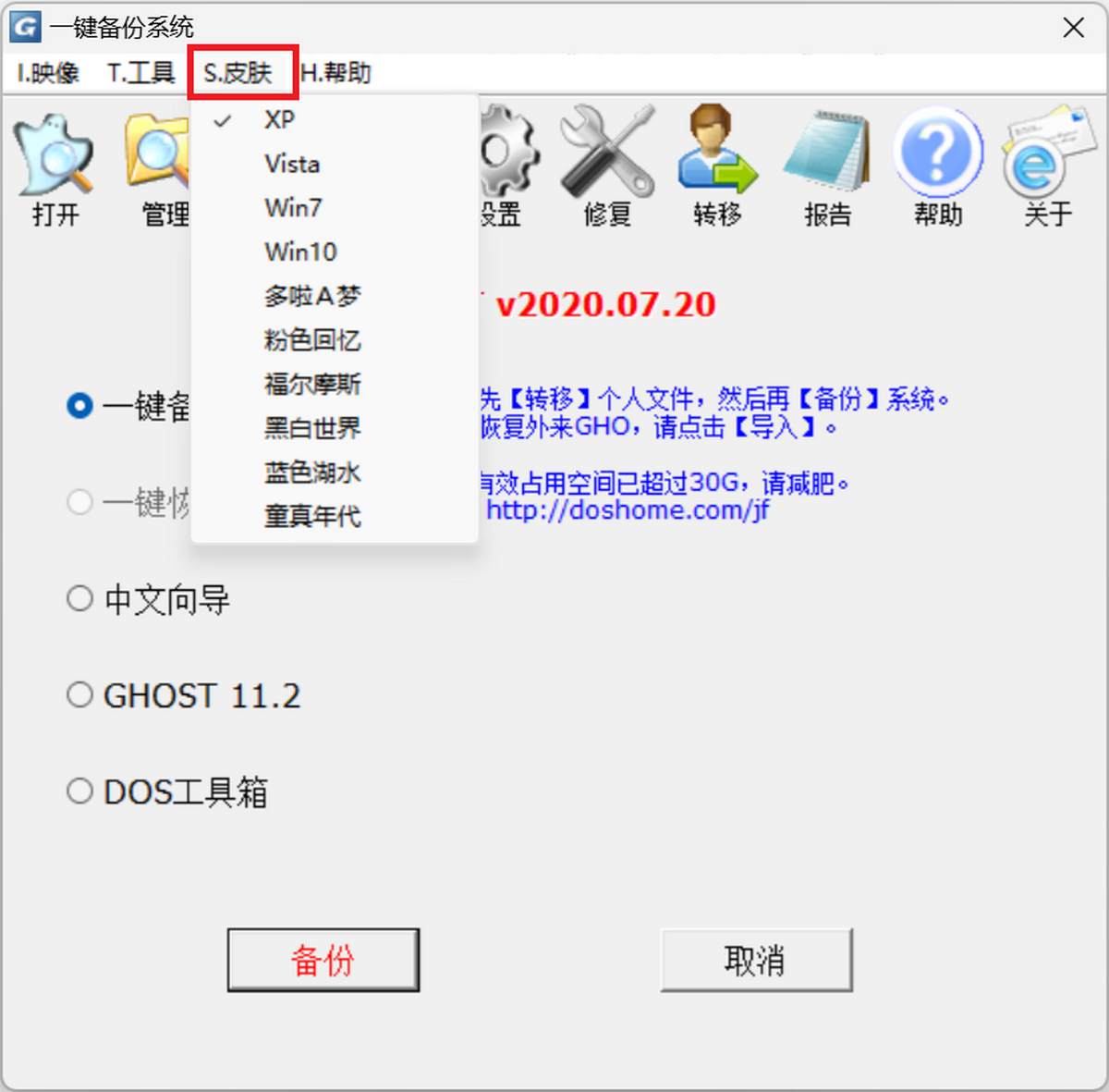在首次“备份”之前,强烈建议使用“个人文件转移工具”把“我的文档”、“桌面”等个人文件夹从C盘转移到D盘,本工具一次使用,永久有效,再也不用担心重装或恢复系统后文件丢失了。另外,通过转移还可以为系统减肥,永不反弹,而且可以节省备份系统的时间和减少映像的体积。