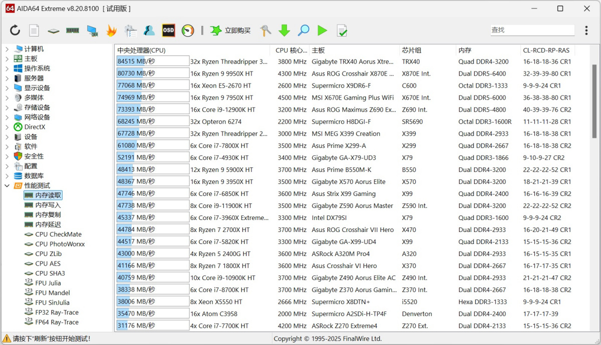 AIDA64 实现了一套64位基准测试,用于衡量计算机执行各种数据处理任务和数学计算的速度。提供多线程内存和缓存基准测试,可用于分析系统内存带宽和延迟。