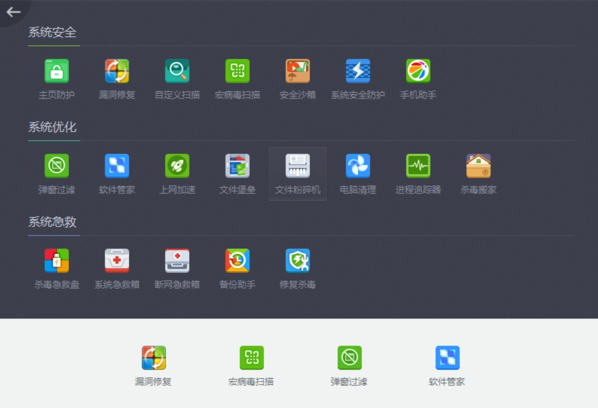 集成了360杀毒的所有精选功能。点击“功能大全”后,全界面展现推荐功能,让您更加方便快捷地找到需要的功能,并且调整快捷工具栏。