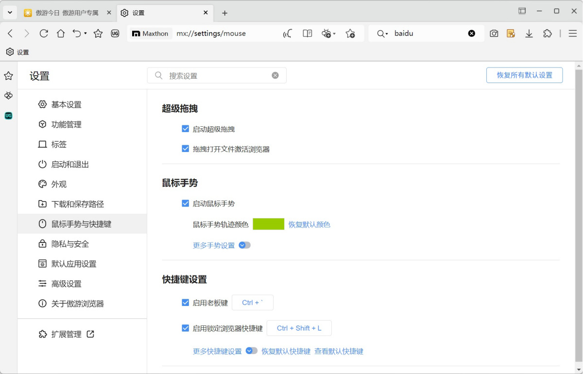 4、鼠标手势:鼠标手势通过简单的动作提供直观的导航控制,加快Maxthon浏览器的浏览速度。