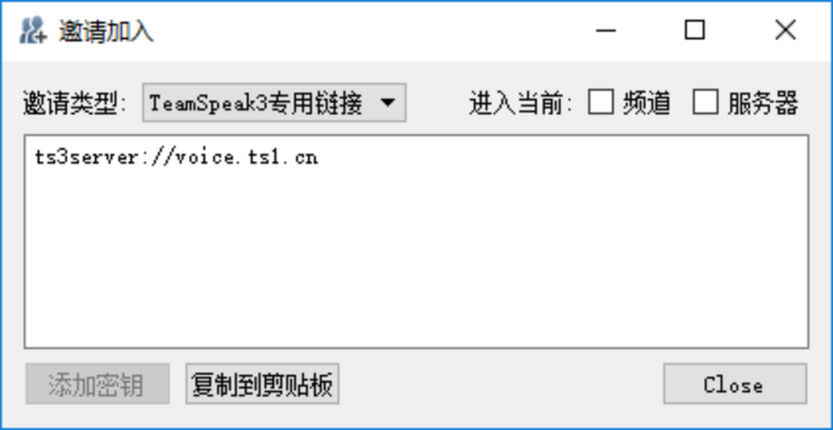 点击Teamspeak 3软件菜单栏的【工具】→【邀请加入】,将窗口中的链接复制发给您的朋友。您的朋友通过浏览器将这个链接打开,系统将会自动调用TemSpeak 3程序并且连接至您的Teamspeak服务器。