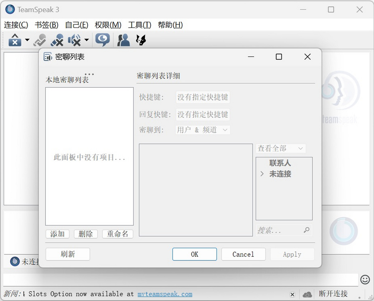 TeamSpeak 3(64位)是全球流行的团队语音通讯软件,常用于游戏、会议团队语音沟通,并提供文字聊天、文件共享功能,所有数据加密传输。