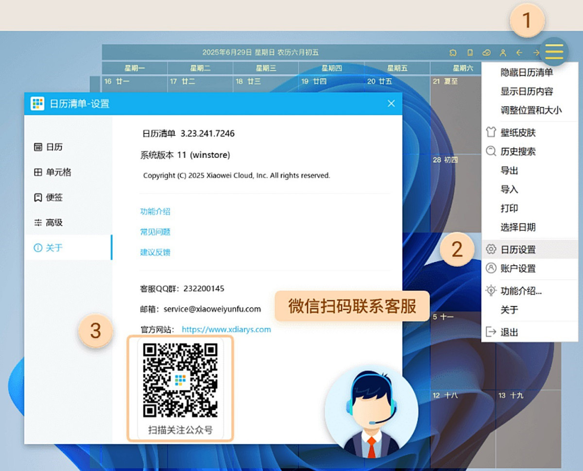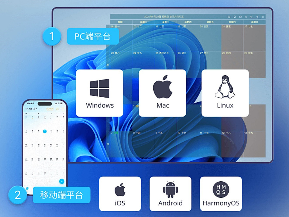 日历清单,可以透明的显示在桌面壁纸上,提供农历、节气、节假日、法定假日显示。双击即可编辑记录琐事、日程安排、重复任务等,还可以微信提醒。支持多端同步数据,实时共享数据,团队协作。