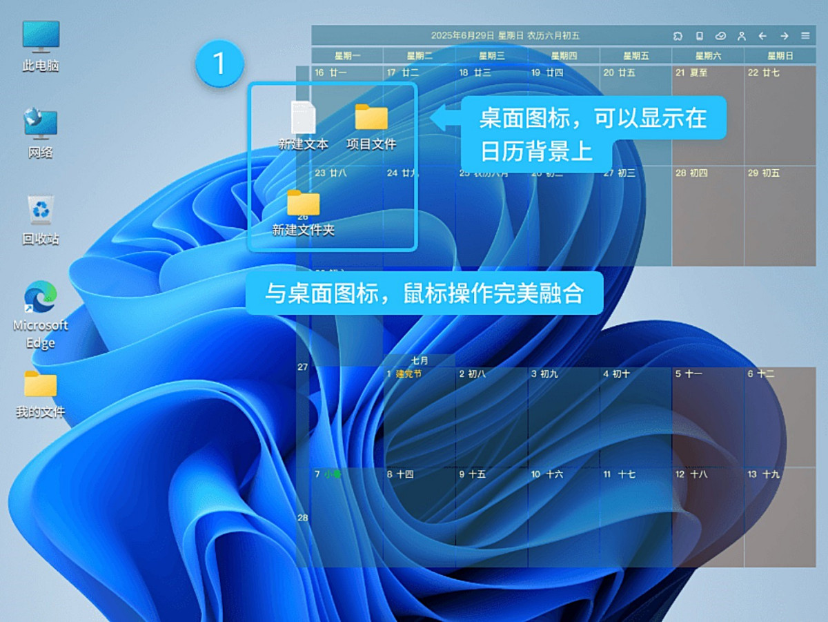 与系统桌面和壁纸无缝融合,您在使用日历的同时,不影响鼠标对桌面的文件、图标的操作