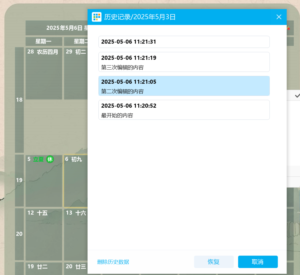 1、比如说5月3号本来有内容的,编辑过3次结果不小心删除了,想看看以前的内容,只需要双击5月3日,进入编辑状态,然后点击历史记录按钮