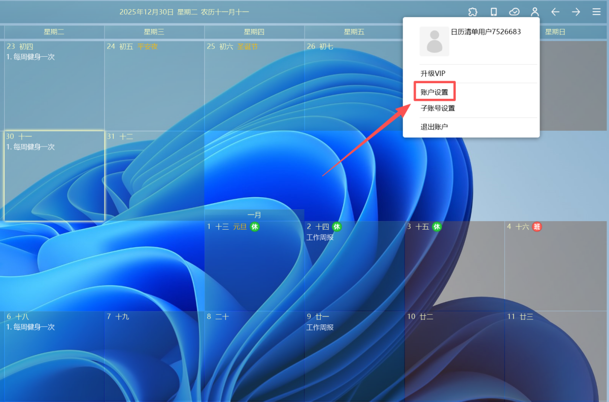 1、点击日历清单右上角【个人中心】,选择【账户设置】