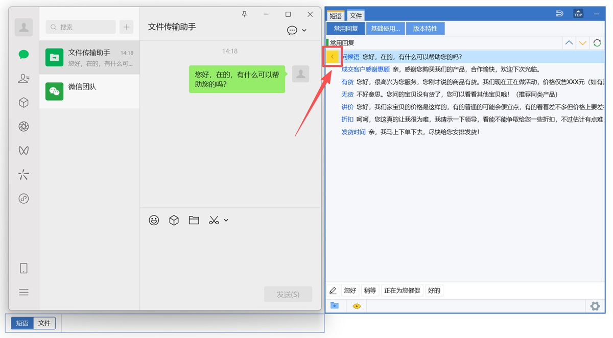 ●点击箭头,即可将内容粘贴到正在聊天的输入框内,并且自动按下回车(即为发送)
