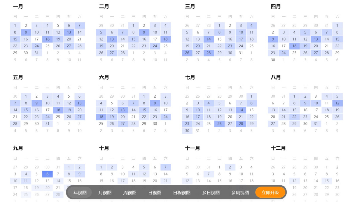 1、年视图:为你提供更宏观的年度视角,开启热力图即可一览全年任务分布,帮助你更好地回顾成果、规划目标。