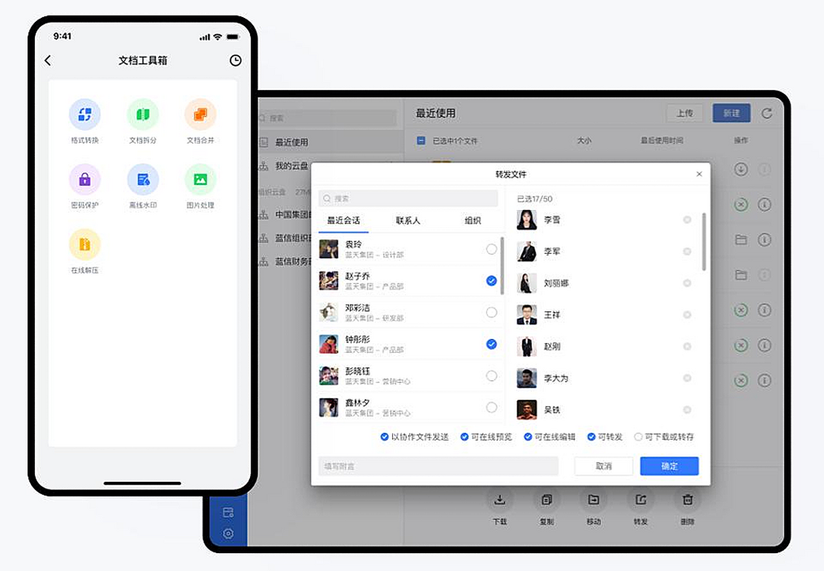 组织内部共享云盘和个人云盘;所有文件支持手机、PC等多终端查看、上传、下载;客户端内嵌文档阅读器,文档资料无需第三方应用打开,保障文档安全;支持对文件设置查看权限。
