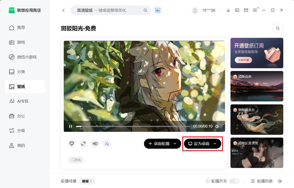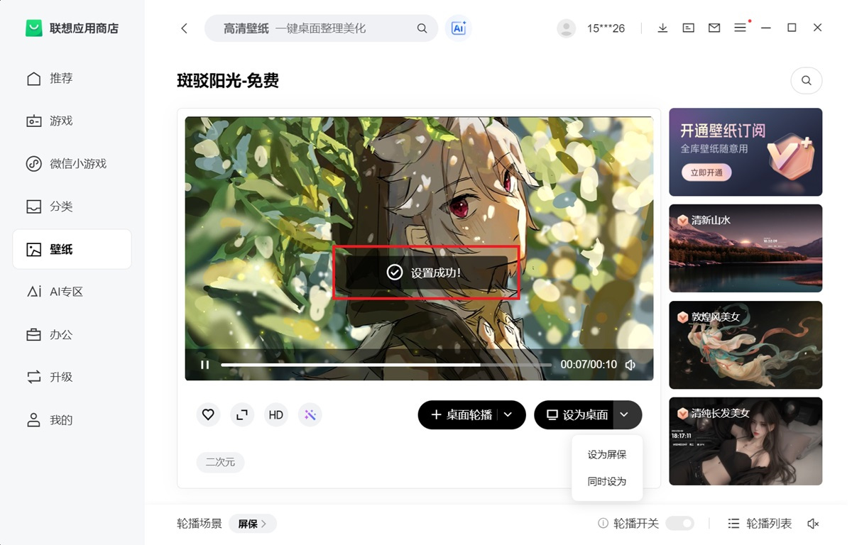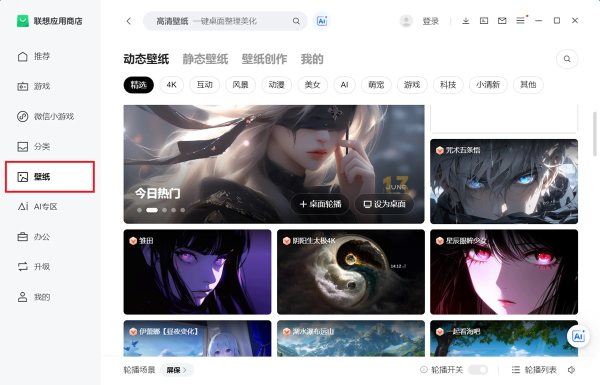 1、下载并打开最新版本的联想应用商店,点击左侧【壁纸】。