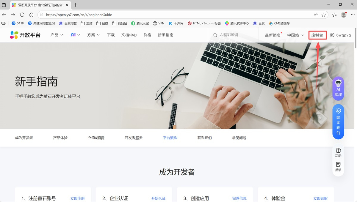 步骤1、1.进入萤石开放平台首页,登入账号,进入控制台