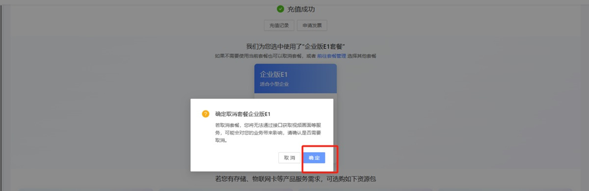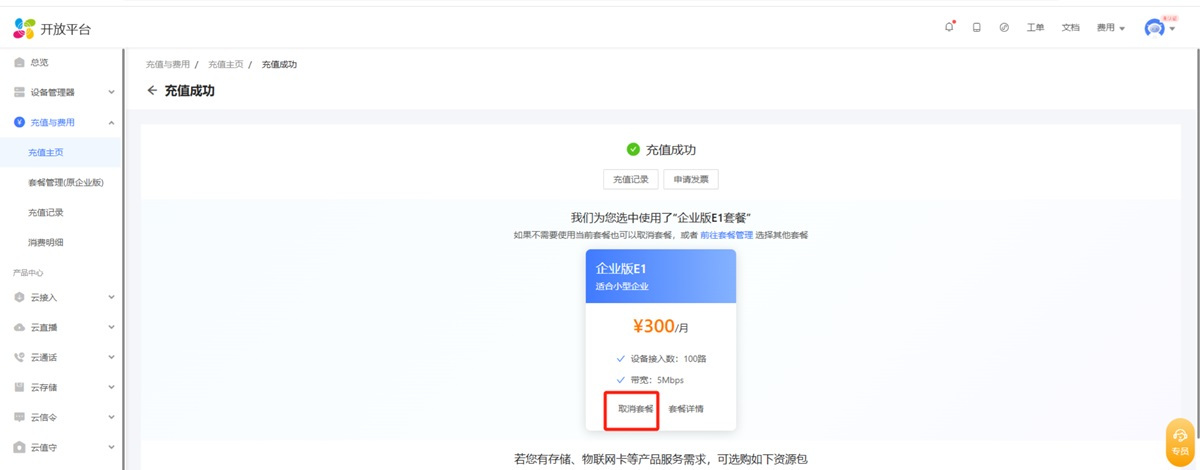 步骤3、充值成功后页面会自动跳转到控制台,如下图所示。点击“取消套餐”