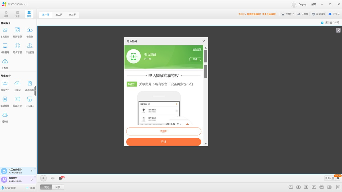 2、可开通电话提醒服务,设备产生告警时,萤石云将立即拨打电话提醒你
