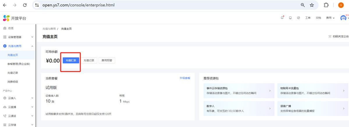 步骤1、进入控制台充值页面,并点击【充值汇款】:https://open.ys7.com/console/enterprise.html