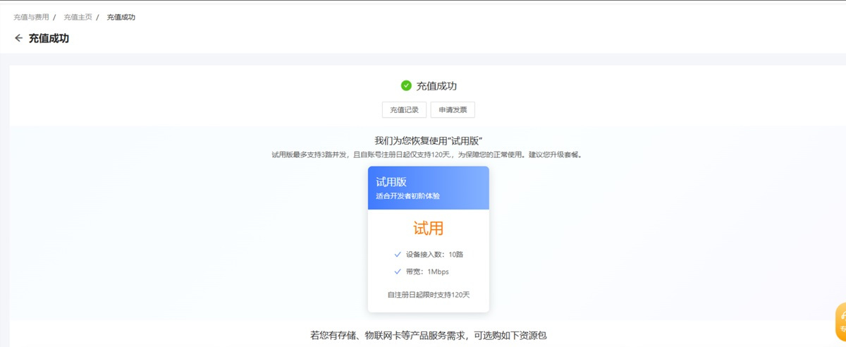 切换成功后充值的金额都在余额内,后续不会扣企业版套餐的基础费用,余额可以用于购买其他产品,比如物联网卡流量