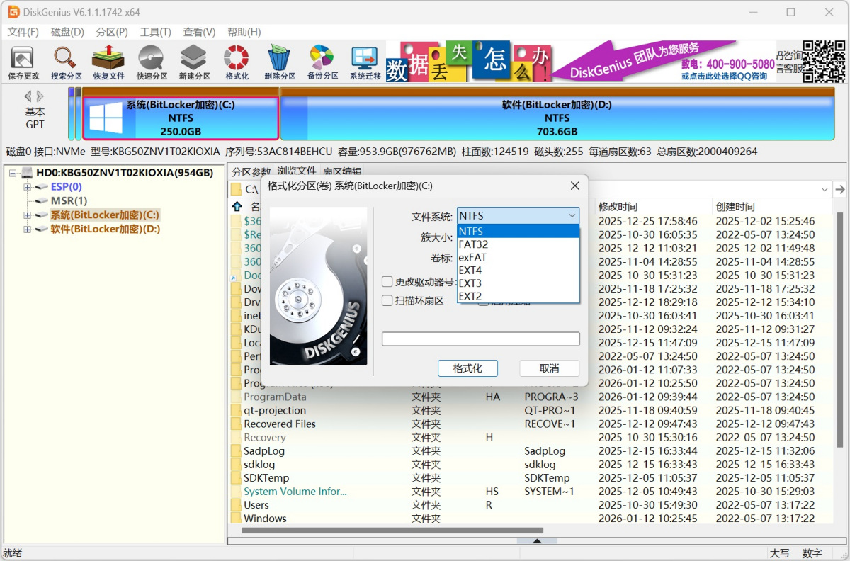 2、格式化分区、克隆分区、克隆磁盘等功能,为保证操作顺利完成,如果目标分区为BitLocker加密分区,则取消其BitLocker加密状态。