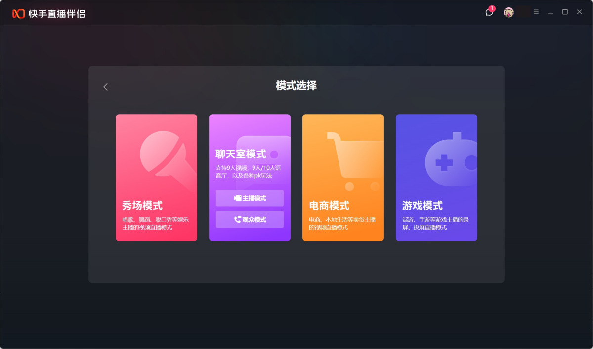 2、认证成功后打开快手直播伴侣客户端,选择您的直播模式。