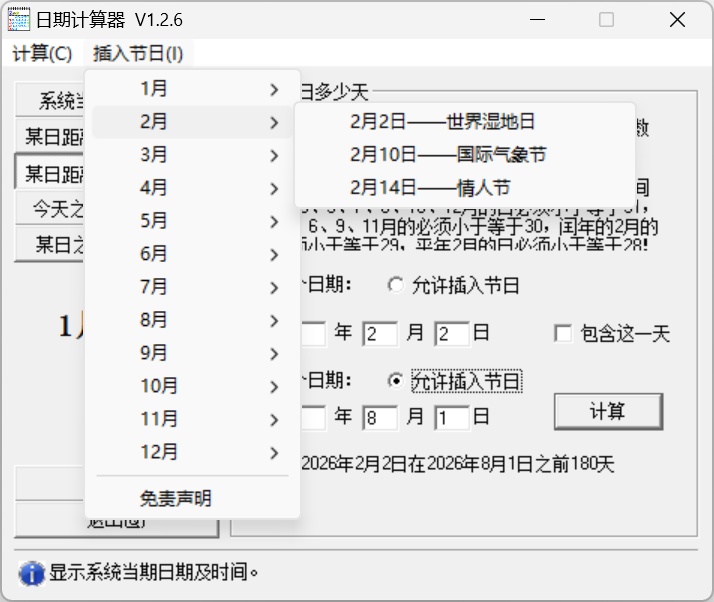 计算两个日期之间间隔多少天时,可分别向两个日期中添加节日,选中“第一个日期”后面的“允许插入节日”即可在第一个日期中插入节日。第二个日期同理。