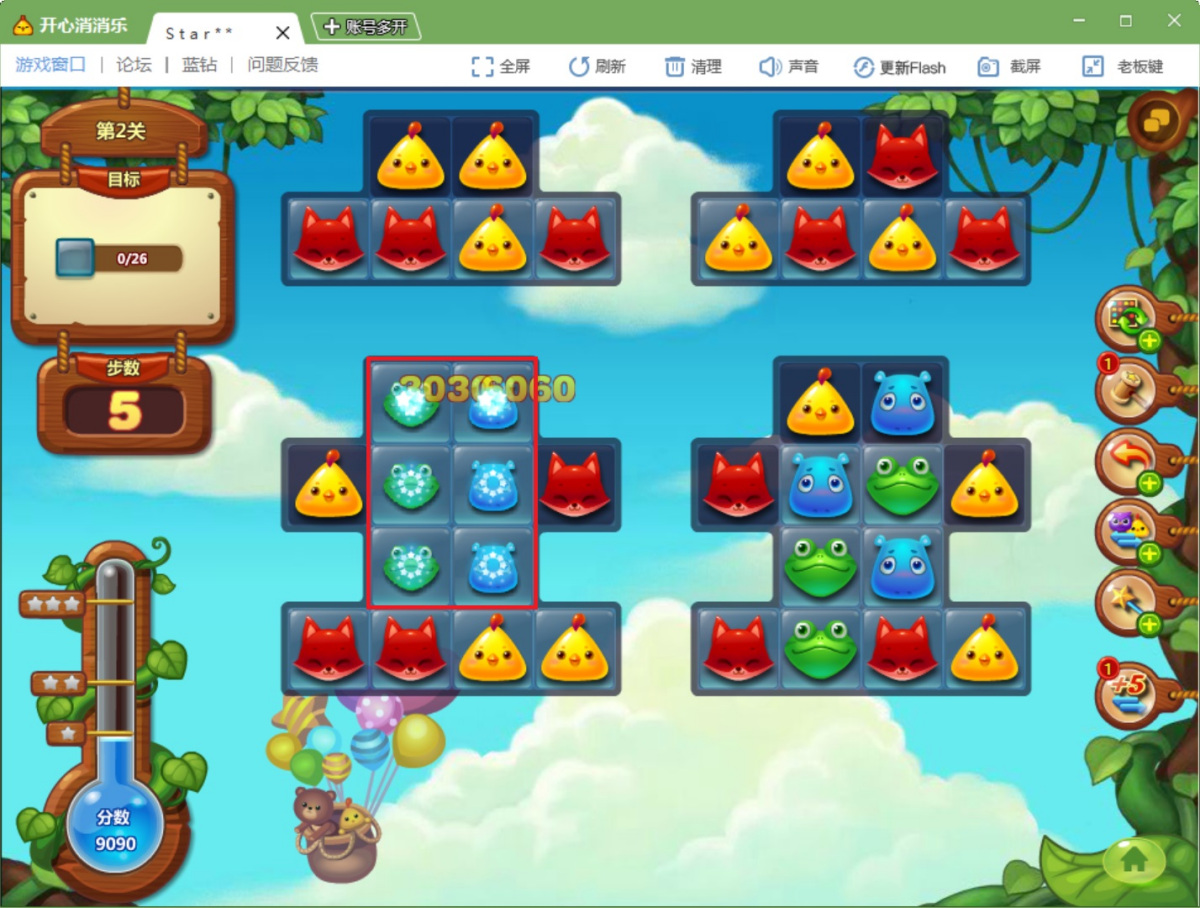 ●彩虹鸟(五连直线):可与任意颜色小动物交换,消除全屏同色棋子。