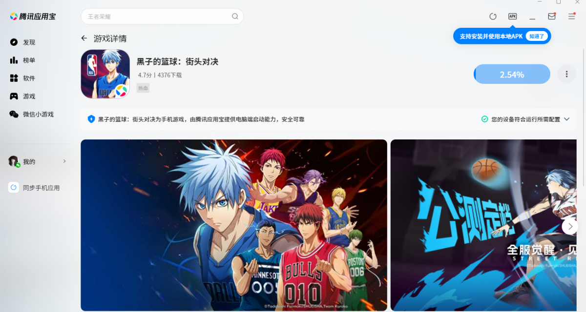 在小杜下载站下载最新安装包,按提示先安装应用宝电脑版(已安装会直接调用打开),然后在应用宝里安装黑子的篮球:街头对决手游,安装好后,直接打开登录就能玩了。