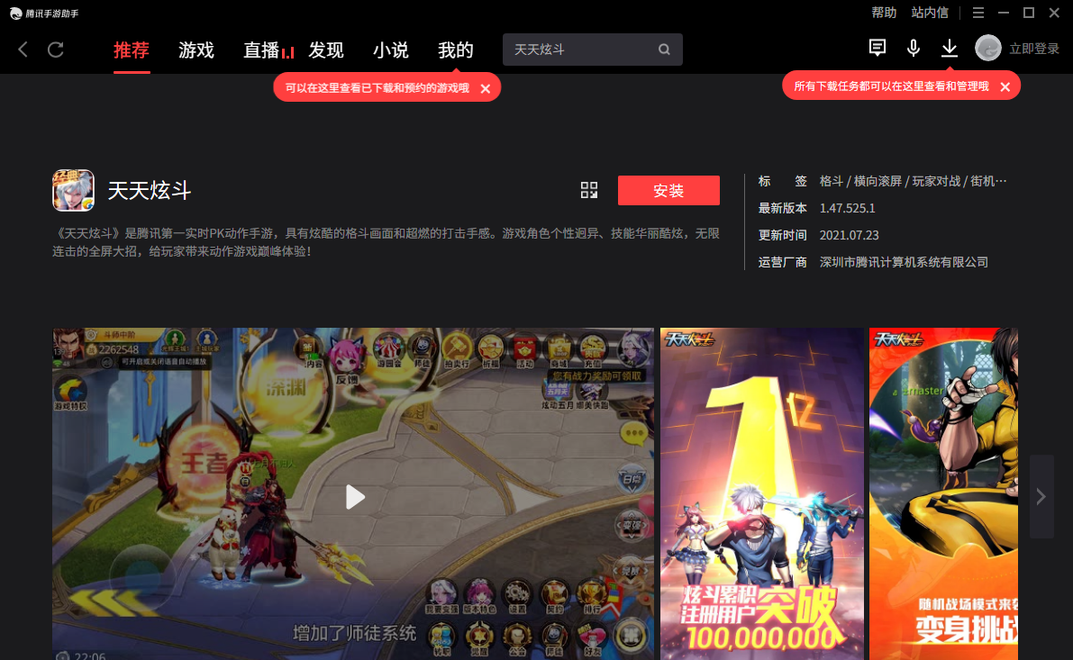 2、在腾讯手游助手中搜索游戏进行安装,完成即可使用