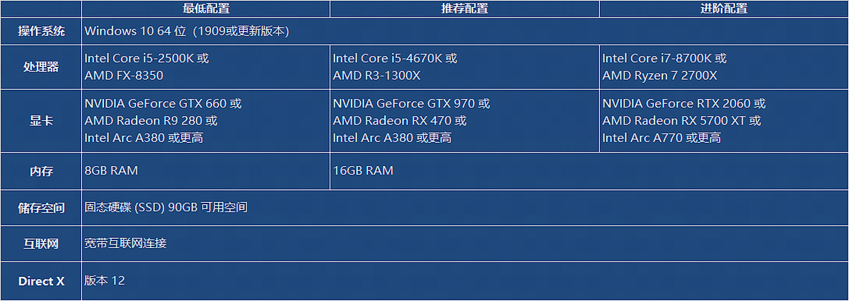 处理器:Intel Core i5-4670K 或 AMD Ryzen 3 1300X
