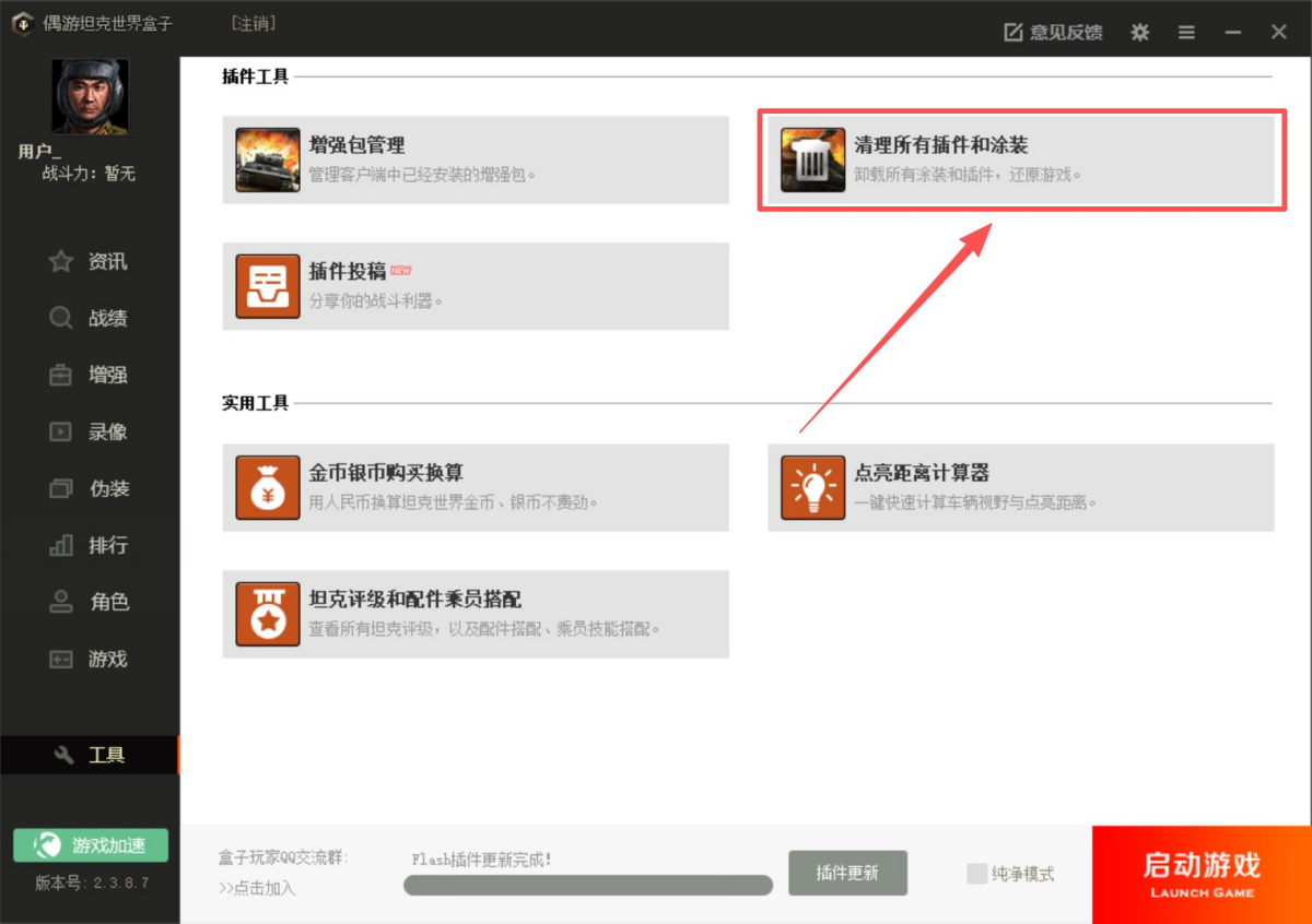 2.使用盒子自带的【工具】下【清理涂装插件】,该功能会把游戏里所有装的插件全部删除干净。