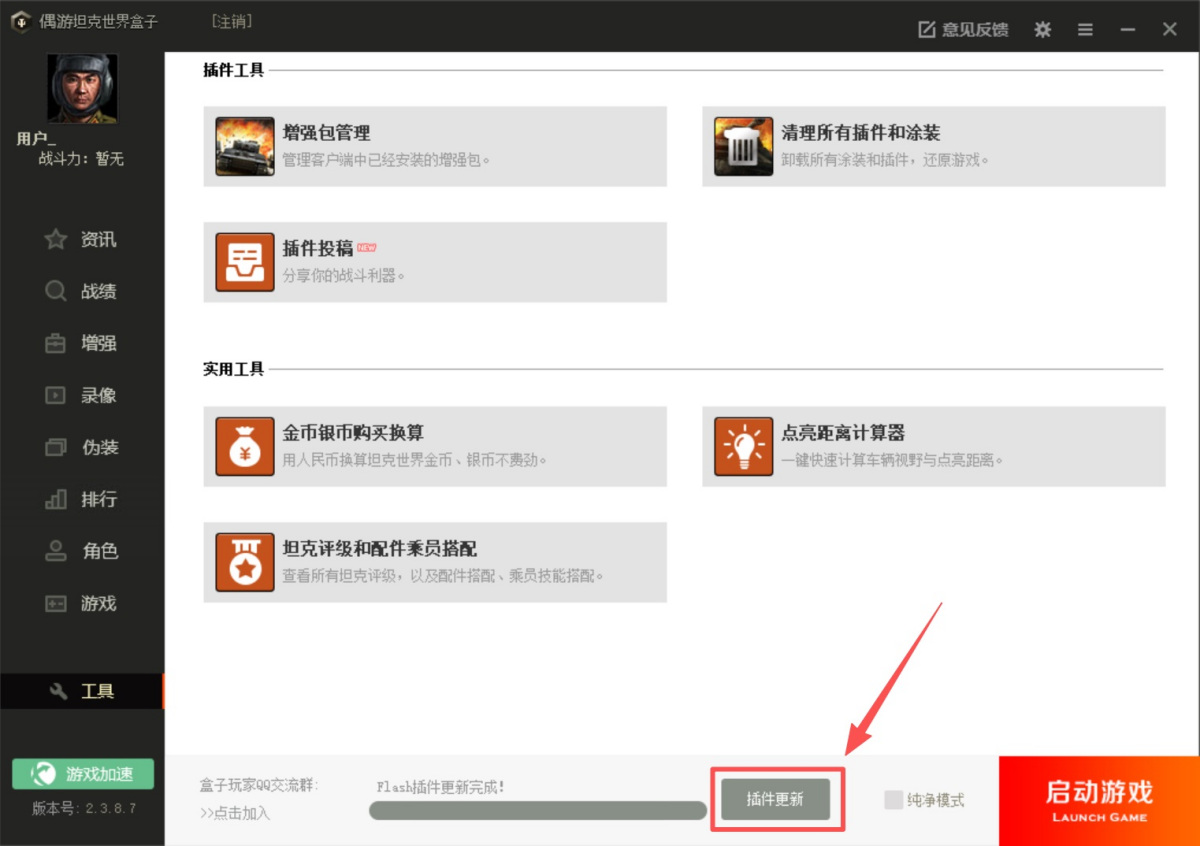 2.点击【插件更新】,更新后巨响和战斗力功能才能使用。