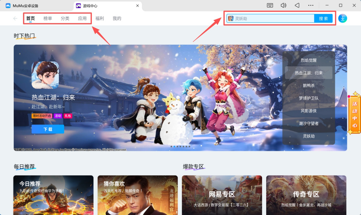 步骤3、您可以在顶部导航栏寻找自己感兴趣的游戏与应用,也可以点击搜索框直接搜索