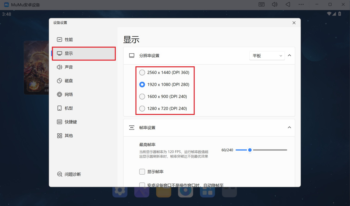 步骤2、在设备设置中选择【显示】,从右侧【分辨率设置】勾选你想要的分辨率大小