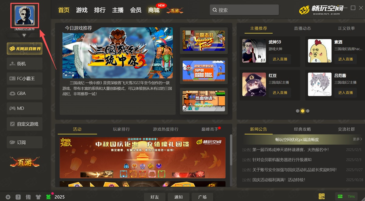 步骤1、打开畅玩空间客户端,点击主界面左上角的【人物头像】