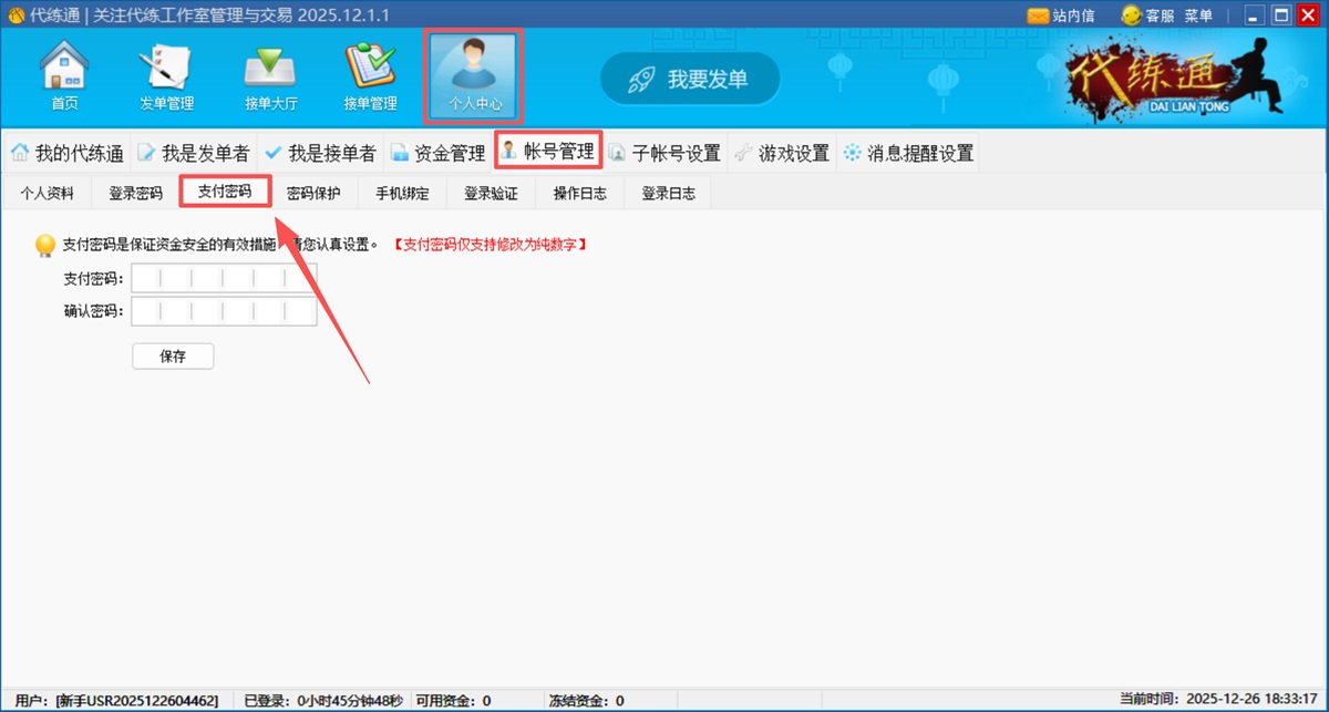 步骤2、设置支付密码,点击顶部【个人中心】→【账号管理】→【支付密码】,输入密码后点击【保存】